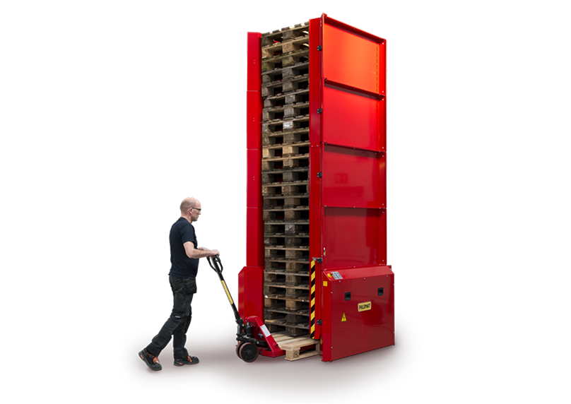 El operario introduce o extrae los palets utilizando una transpaleta o carretilla, realizando toda la manipulación a nivel del suelo para mayor comodidad y seguridad. El foto sensor detecta cada palet para gestionar su apilado o dispensado individualmente.