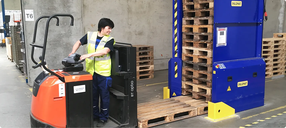 Cuando es necesario seleccionar mercancía, un empleado recupera un palé del PALOMAT® con una carretilla elevadora y lo empaqueta. Los palets vacíos también se depositan en el PALOMAT®, que los apila. Todo esto se realiza a nivel del suelo.