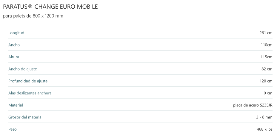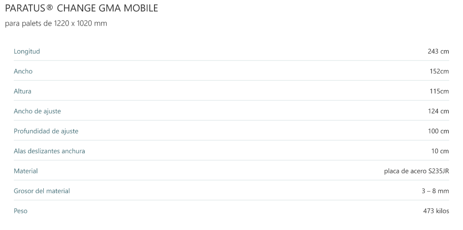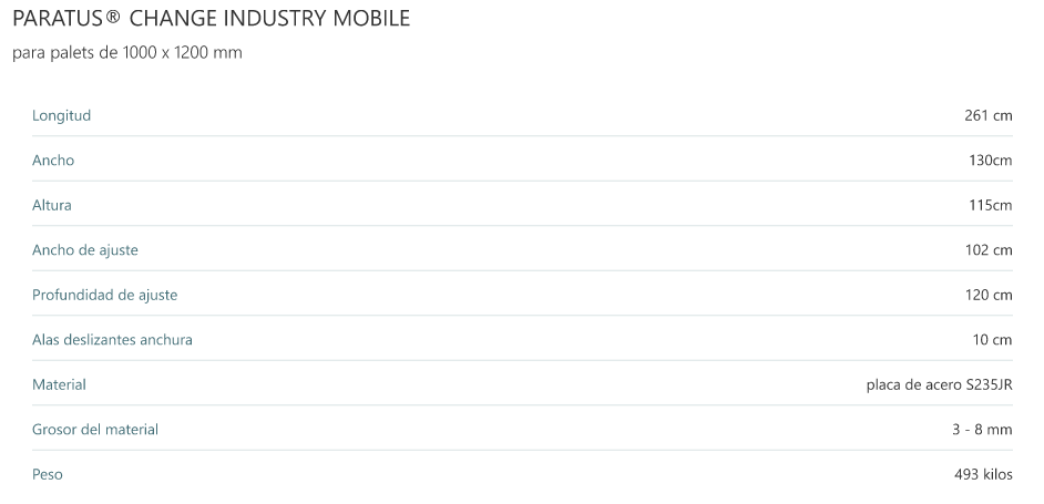 El PARATUS® Change MOBILE es una evolución del modelo PARATUS® Change CLASSIC, que ofrece el mismo método eficiente para cambios de pallets en una configuración móvil. Al igual que el modelo CLASSIC, el principio patentado permite completar el proceso de cambio en menos de 30 segundos. Esto se consigue intercambiando el palet debajo de la mercancía, sin necesidad de mover la propia mercancía.