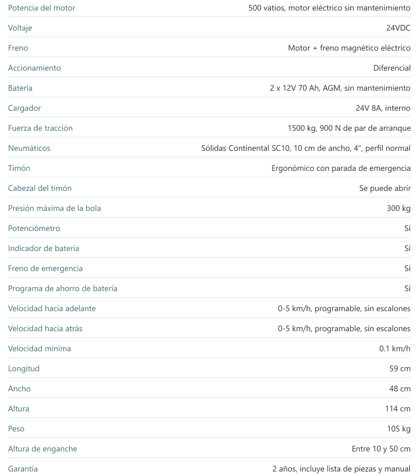 S15 (1.500 kg) Home Productos Remolcadores eléctricos S15 (1.500 kg) Remolcadores eléctricos Anclajes manuales Anclajes eléctricos / hidráulicos Ruedas Videos Catálogos 11 Modelos Gama de remolcadores S12 (1.200 kg) S15 (1.500 kg) M18 (1.800 kg) L25 (2.500 kg) XL35 (3.500 kg) XL50 (5.000 kg) XL75 (7.500 kg) XXL10 (10.000 kg) XXL20 (20.000 kg) 3XL Trailer Mover Ver modelos Información y Consultas Solicitar Información Multi-mover S 15 (hasta 1.500 kg de fuerza) Remolcador eléctricoidóneo para maniobrar en espacios reducidos para arrastre de cargas hasta máximo 1.500 kg Descripción Especificaciones 1000 x 1200 mm El S15 es el empujador eléctrico ideal para mover camas, carros de palets y cestas de alambre de hasta 1500 Kg.Puede elegir entre varios enganches. Información adicionalCE y declaración de conformidad, 12 meses de UVV.Se suministra completo con 2 baterías, cargador y embrague.Puede comenzar a utilizarlo de inmediato. Todos los modelos de remolcadores multimover Multi-Mover S12 (1.200 kg) Idóneo para maniobrar en espacios reducidos para arrastre de cargas hasta máximo 1.200 kg Ver producto Multi-Mover S15 (1.500 kg)Idóneo para maniobrar en espacios reducidos para arrastre de cargas hasta máximo 1.500 kg. Ver producto Multi-Mover M18 (1.800 kg) Con el Multi-Mover M18 puede maniobrar fácilmente su remolque de 1.800 kg. Ver producto Multi-Mover L25 (2.500 kg) Con el Multi-Mover L 25 puede mover y maniobrar con facilidad remolques, carros u otros vehículos. Ver producto Multi-Mover XL35 (3.500 kg) Con el Multi-Mover XL puede mover y maniobrar con facilidad remolques, carros u otros vehículos sobre terreno llano. Ver producto Multi-Mover XL50 (5.000 kg)El XL50 se mueve hasta 5000 kg. Ver producto Multi-Mover XL75 (7.500 kg) El XL75 se mueve hasta 7500 kg Ver producto Multi-Mover XXL10 (10.000 kg) El Multi-Mover XXL10t es un tractor de arrastre versátil y económico para tirar cargas de hasta 10,000 kg. Ver producto Multi-Mover XXL20 (20.000 kg) El Multi-Mover XXL20t es un tractor de arrastre versátil y económico para tirar cargas de hasta 20,000 kg. Ver producto Multi-Mover 3XL (hasta 40.0000 kg) El Multi-Mover 3XL es un tractor de arrastre versátil y económico para tirar cargas de hasta 40,000 kg. Ver producto Multi-Mover TM Trailer MoverGracias al Trailer Mover un solo operador puede mover remolques articulados de camión de hasta 20.000 kg Ver producto ¿Necesita una Solución Ergonómica? Contacte con nuestro equipo especializado para encontrar la soluciónperfecta para su empresa Contactar Ahora Ver productos