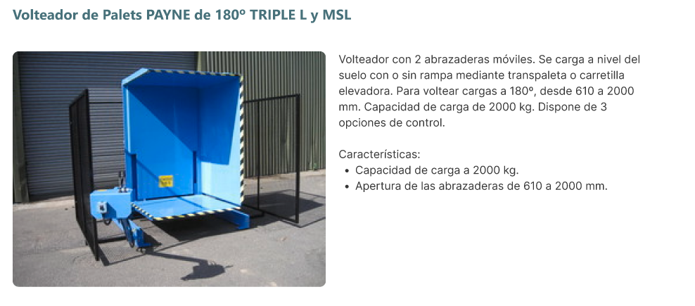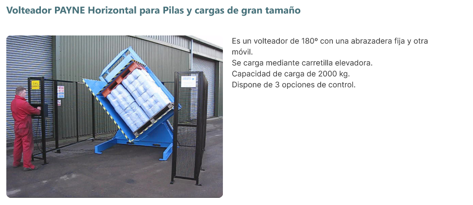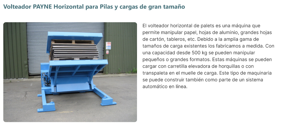 - PAYNE también ofrece un volteador horizontal para pilas y cargas de gran tamaño.