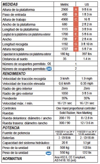 Manejable en su total altura de trabajo a 4.9 mt (9.6’) con la carga máxima y la plataforma completamente extendida a una velocidad
