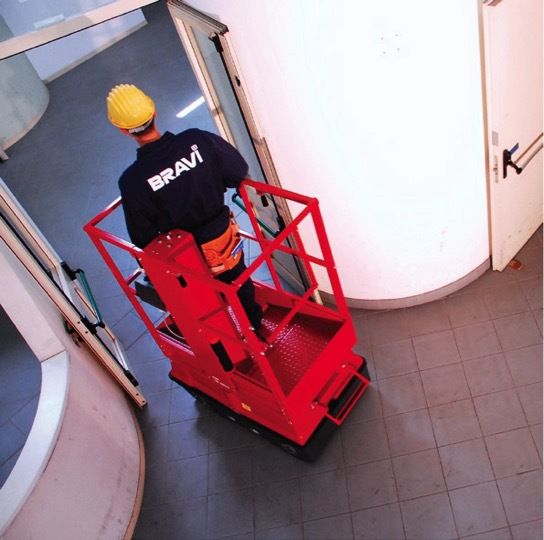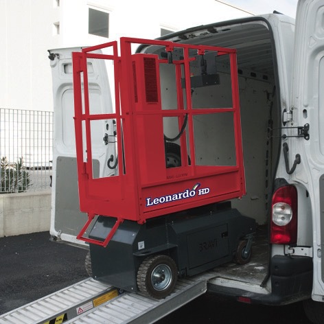 Con Leonardo HD, el usuario puede pasar por todas partes con facilidad - a través de puertas, rampas de acceso y en espacios reducidos - gracias al tamaño extremadamente compacto de esta plataforma y el 35% de pendiente permitida.